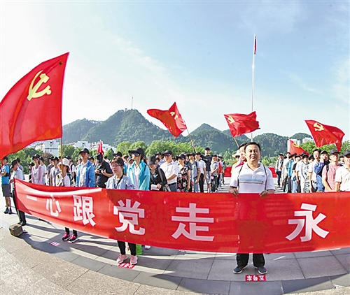 6月27日,安徽省歙縣舉辦“一心跟黨走 永遠(yuǎn)在路上”活動(dòng)迎接黨的生日。當(dāng)日,200名縣直機(jī)關(guān)黨員和非公企業(yè)的黨員從縣城出發(fā),沿著革命先烈走過的足跡,到達(dá)溪頭鎮(zhèn)汪滿田村紅軍紀(jì)念碑。活動(dòng)中舉辦升國(guó)旗、唱國(guó)歌儀式,沿途宣傳環(huán)保、扶貧、文明創(chuàng)建等內(nèi)容。吳建平攝