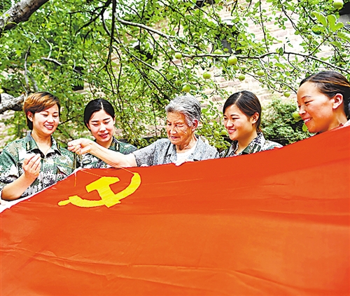 6月30日,中國(guó)歷史文化名村河北省沙河市王硇村開展“同心共筑中國(guó)夢(mèng) 紅色基因永傳承”主題活動(dòng),一位60年黨齡的老黨員帶領(lǐng)女子民兵班的民兵,一針一線將中國(guó)共產(chǎn)黨黨徽繡在鮮艷的紅旗上,以表達(dá)對(duì)黨的無限熱愛、對(duì)祖國(guó)的美好祝福。趙永輝攝